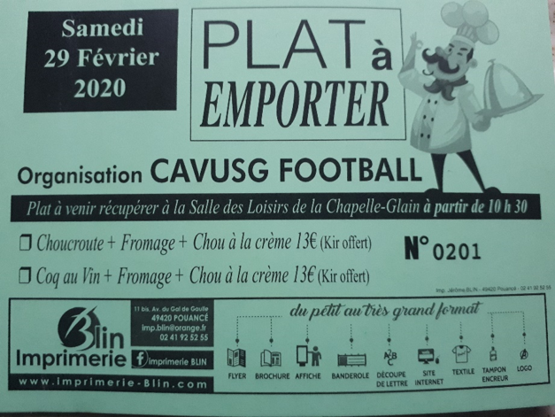 Plat à emporter - CAVUSG Samedi 29 février 2020 A récupérer à la Salle Polyvalente de La Chapelle Glain, le matin Choucroute ou Coq au vin 13 € Article publié le 28 janvier 2020 - actualisé le 28 janvier 2020